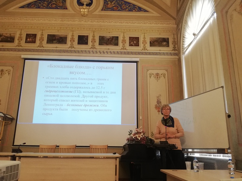 Наталья Гарриевна Костюкевич из Санкт-Петербургского Государственного лесотехнического университета рассказала о «блокадных блюдах» с горьким вкусом. Добавление в хлеб целлюлозы, хвойный натуральный экстракт – разработки ученых Ленинградской лесотехнической академии, (ЛТА) помогали в тяжелейших условиях блокадного города бороться с цингой, восстанавливать силы раненым бойцам и детям блокадного Ленинграда. Хвойная хлорофилло-каротиновая паста использовалась для лечения ран, ожогов и обморожений.