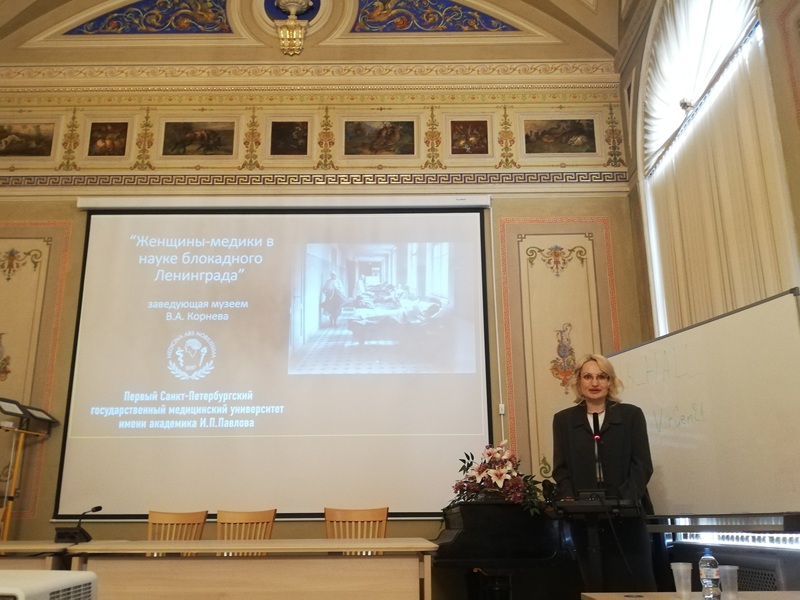 Валерия Андреевна Корнева из Первого Санкт-Петербургского Государственного медицинского университета им. И.П. Павлова представила доклад о женщинах-медиках в науке блокадного Ленинграда. Она подчеркнула их вклад в помощь населению в условиях нехватки медикаментов и ресурсов в борьбе с дистрофией, а также в лечении раненных бойцов Ленинградского фронта.