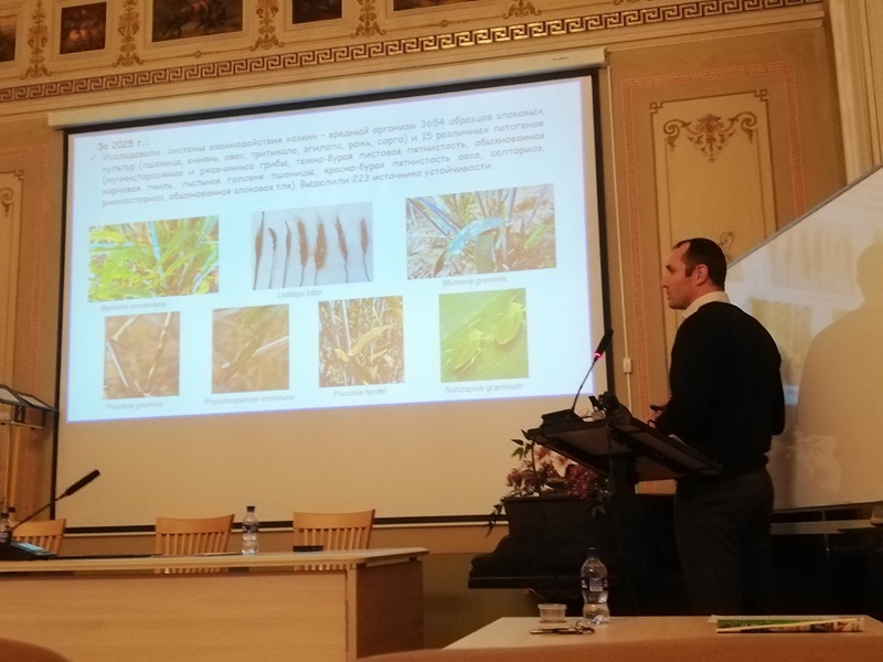 Далее звучали доклады о современных методах исследований растений: от полногеномного анализа сои и овса до транскриптомных исследований гуара и маркерной селекции пшеницы, ячменя, подсолнечника и сорго. Особое внимание уделено изучению генов устойчивости к болезням и стрессам, включая стеблевую ржавчину, фитофтороз и засуху. Также обсуждались вопросы изучения коллекции гуара и донника как источников адаптивных генотипов.